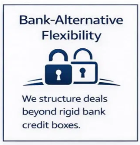 Solutions designed around how businesses and assets actually operate. We adapt capital structures to fit transitional, growth, and non-standard situations without forcing deals into rigid boxes.
