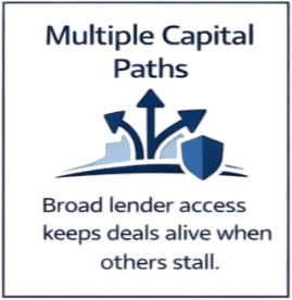 Access to lending and investment partners aligned with deal objectives, risk profiles, and execution timelines. Relationships are curated to support outcomes—not maximize volume.